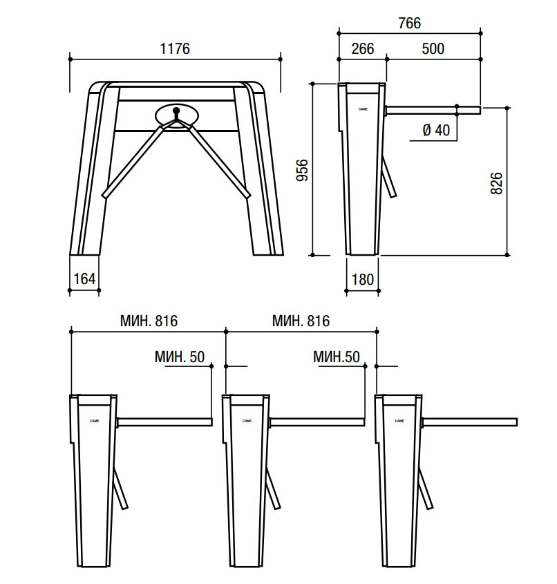 Турникет свободно вращается при легком нажатии на планку трипода.