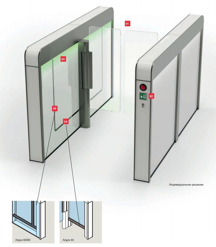 L-образная световая завеса системы Argus 60 и 80 точнее контролирует открытие и закрытие благодаря дополнительному вертикальному датчику. Данная система распознает человека, пытающегося пройти без разрешения даже в том случае, когда расстояние до первого посетителя составляет около 100 мм. Таким образом, пройти через барьер может только один человек, даже если он несет чемодан или едет в каталке. Также выполняется контроль прохода в неправильном направлении.