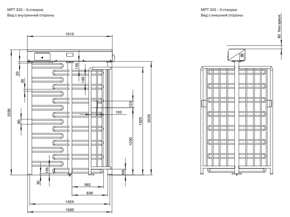 • Размеры турникета: 1510 x 1288 x 2235 мм