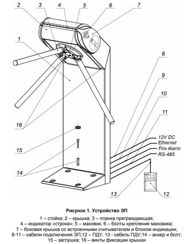 Электронная проходная состоит из: стойки (1-3) со встроенными в нее контроллером, двумя считывателями бесконтактных карт доступа с блоками индикации, трех преграждающих планок (4) и пультом дистанционного управления (13).