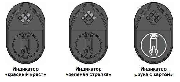 • При считывании идентификатора карты доступа в любом режиме подается звуковой сигнал длительностью 0,2 с, индикатор «рука с картой» меняет свое состояние на 0,2 с. Состояние других индикаторов не меняется.
