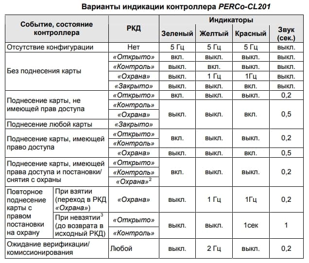 Возможные варианты индикации контроллеров второго уровня серии PERCo-CL201 представлены в табл. 3. Индикация отображается с помощью цветовых индикаторов, расположенных на лицевой поверхности корпуса.