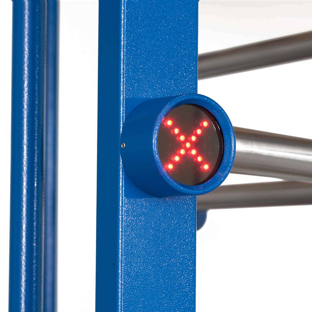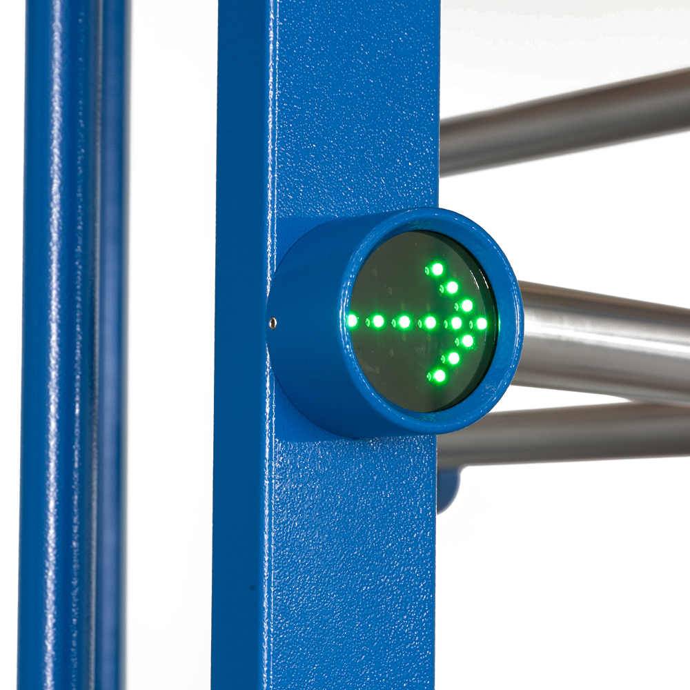 Турникет снабжен встроенными световыми индикаторами разрешения и запрещения прохода со сверх яркими светодиодами. Есть возможность подключения дополнительных выносных световых индикаторов.