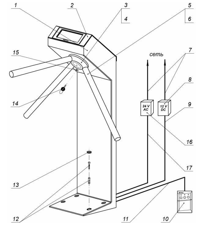 Общий вид турникета: 1 – стойка турникета; 2 – крышка с блоком индикации; 3 – планшайба; 4 – поворотный механизм; 5 – преграждающая планка; 6 – болт М8 для крепления преграждающей планки; 7 – сетевой кабель1 ; 8 – источник питания турникета1 ; 9 – кабель питания1 ; 10 – ПДУ/ устройство РУ1 / контроллер СКУД1 ; 11 – кабель от ПДУ/ устройства РУ1 / контроллера СКУД1 ; 12 – анкер1 ; 13 – заглушка; 14 – ключ механической разблокировки; 15 – замок механической разблокировки; 16 – источник питания системы подогрева, 17 – кабель питания системы подогрева