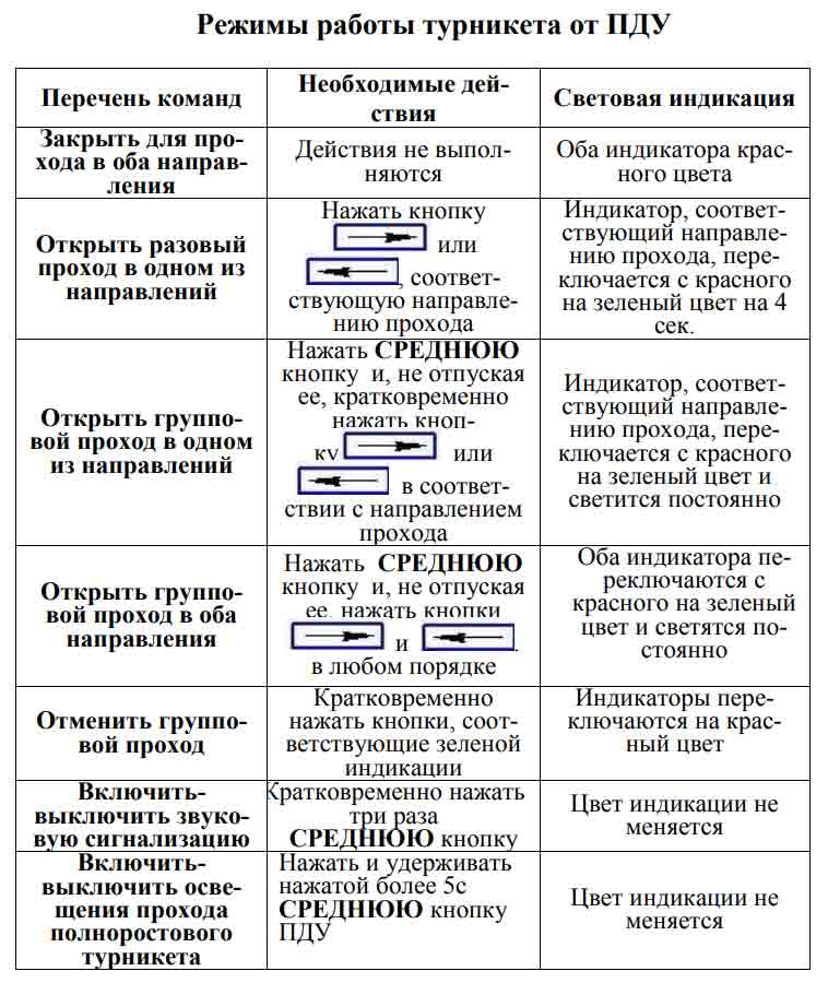 Режимы работы турникетов от ПДУ указаны в таблице.