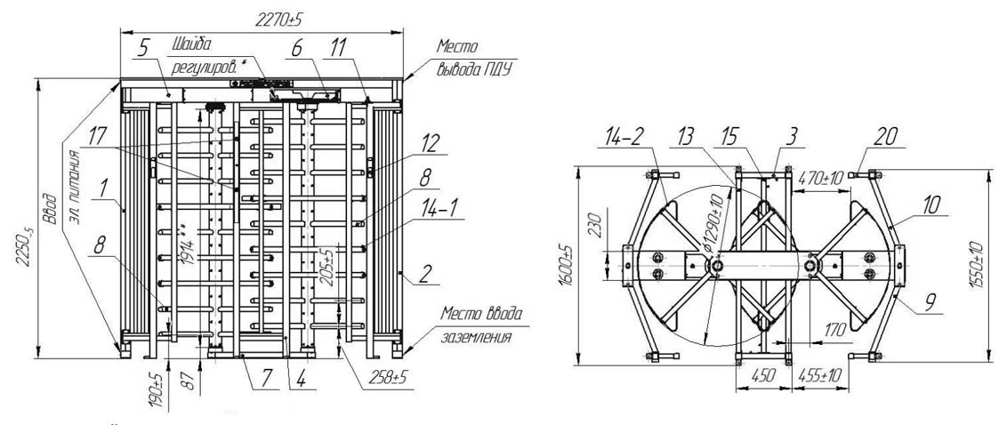 – установите на место крышки 16 (выполнить после подключения турникета и проведения режима калибровки) и закрепите винтами М4.