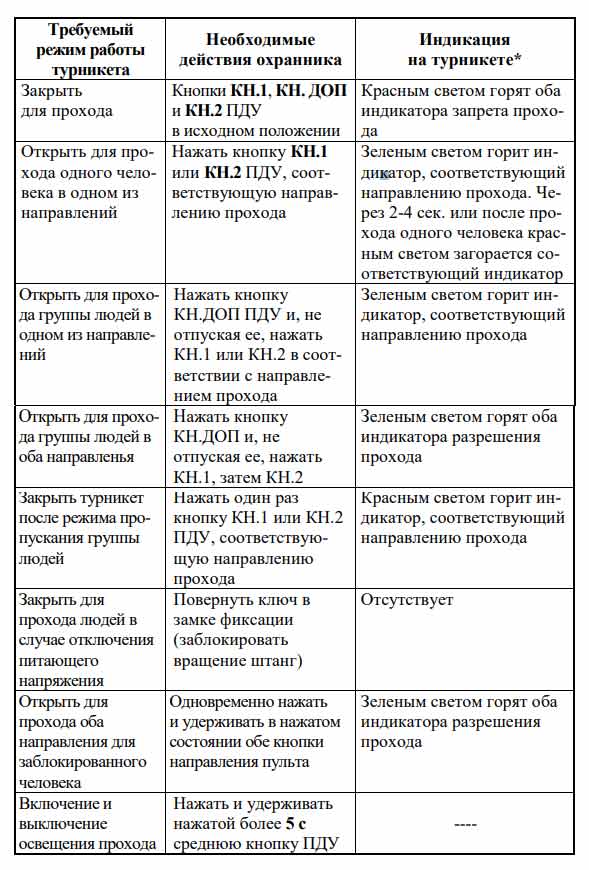 – одновременно нажаты и удерживаются кнопки «КН.1» и «КН.2» ПДУ, при этом оба световых индикатора светятся красным цветом, а звуковая сигнализация отключается. При снятии режима тревоги с ПДУ происходит отключение стопорного механизма, что позволяет поворачивать механизм в любом направлении до следующего исходного положения. В этом случае возможно перемещение механизма на один проход, при котором сигнал для СКУД о факте прохода не выдается.