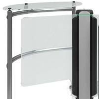 FlowMotion® mTwing моторизированный полуростровой роторный турникет для стеклянных створок (створки поставляются отдельно), доступно более 20 цветовых оттенков, низкая сила при ударе, разблокировка при отключения питания, материал тумбы - алюминий, 100% интенсивность работы, возможна установка подсветки пола и тумбы, высота 1034 мм.