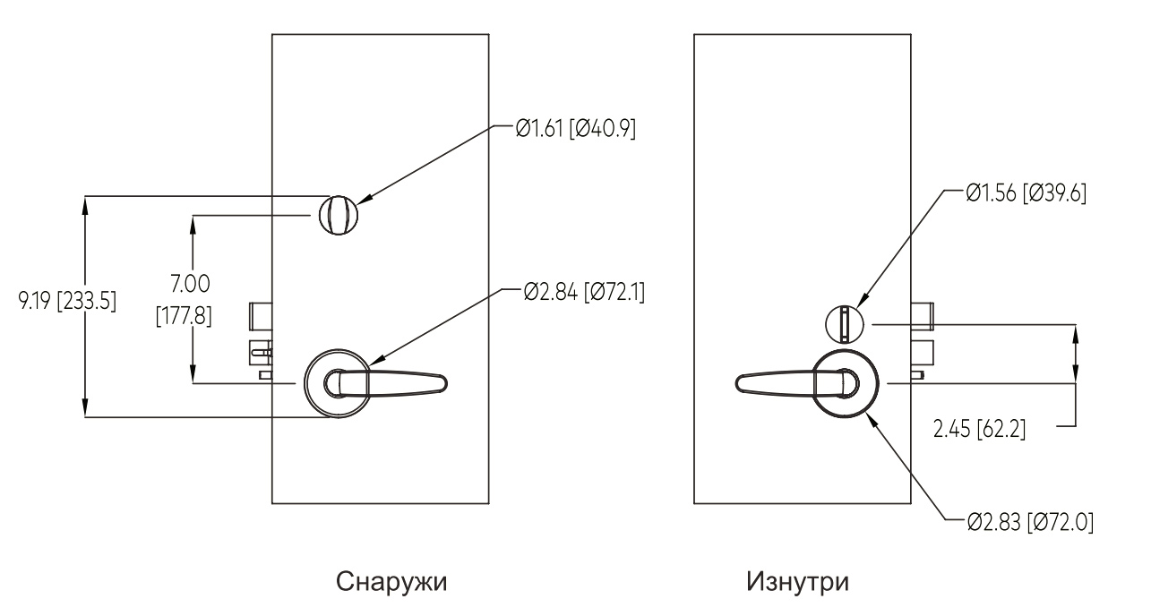 • Толщина двери: От 1,75” (44,45 мм) до 3” (76,2 мм). Двери без выступа врезной части, двери без притвора.